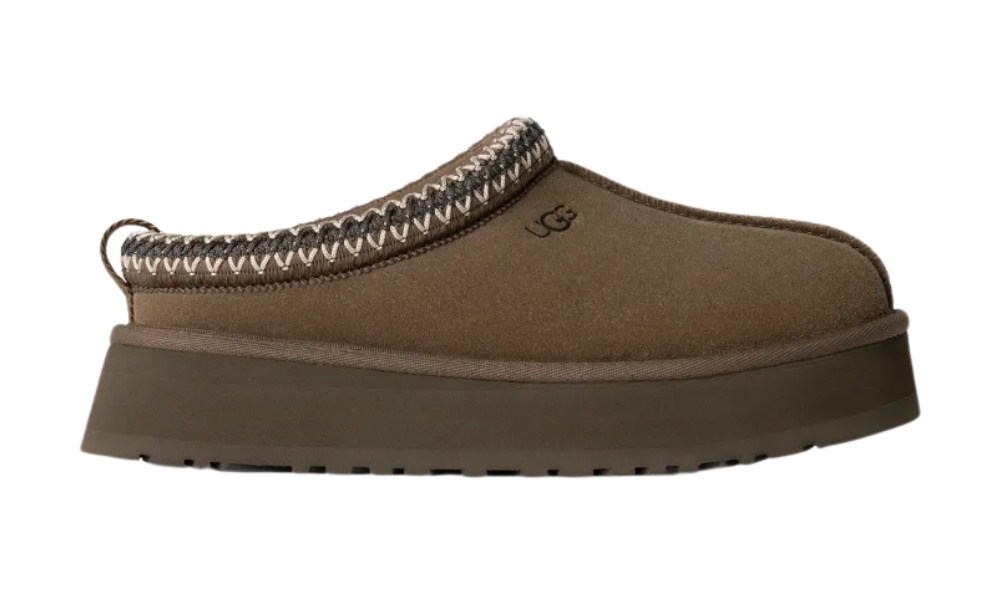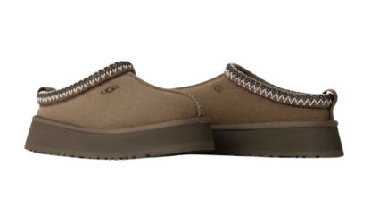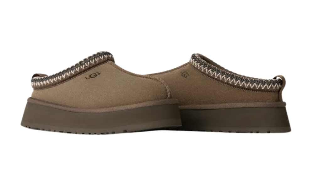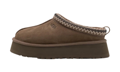 Az UGG papucsok sziluettjével rendelkezik, 1,5” platformtalppal az extra párnázottság érdekében. Ugyanabból a szarvasbőr felsőrészből készült, mint az eredeti, gesztenye színben. Emellett az UGG jellegzetes plüss gyapjúkeverékével van bélelve a papucsszerű érzés érdekében. Textilkötése 100%-ban újrahasznosított poliészterszálas anyagból készült.